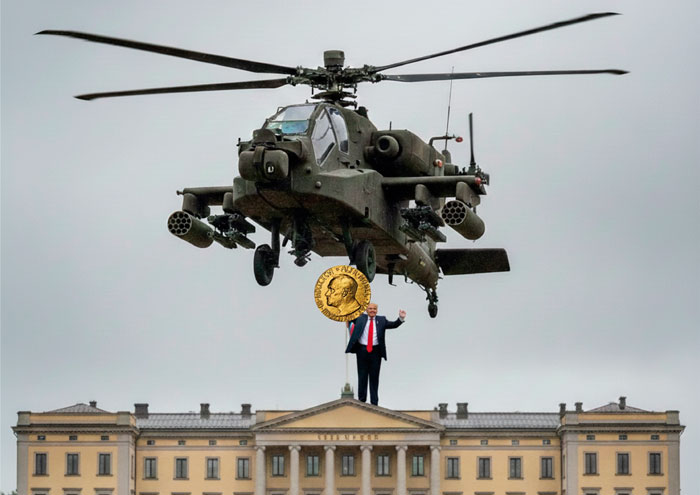 Humillado porque no haber recibido el Premio Nobel de la Paz, el presidente gringo, Donald Trump, fue a llevar la democracia a Noruega para secuestrar el galardón que obviamente le pertenece, por fomentar la paz a nivel mundial gracias a sus aviones caza, sus buques de guerra, sus drones, misiles y helicópteros apache.